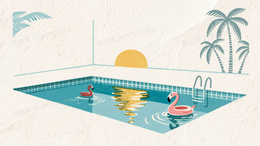 复古丝网印刷风格泳池侧视剖面展现金色夕阳倒影