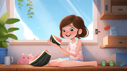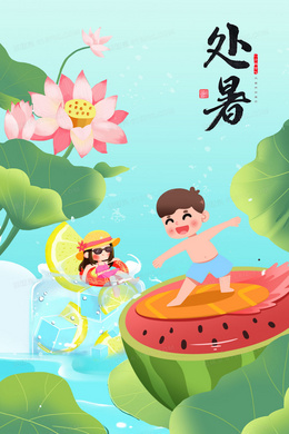 女孩海边吃冰沙避暑处暑节气插画