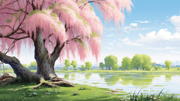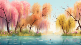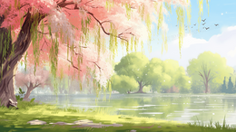 春天河边的垂柳树唯美风景插画