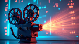 > 在数字蓝色背景上的老款电影放映器特写