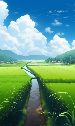 竖版蓝天白云下的绿色稻田和羊肠小路