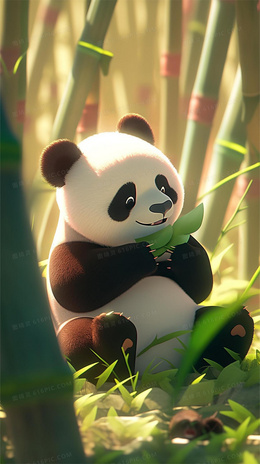 清新竹林里一只可爱的熊猫在吃竹子