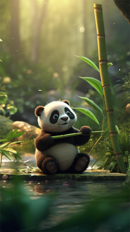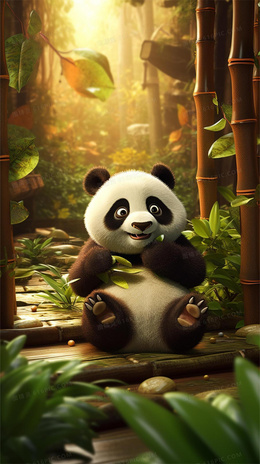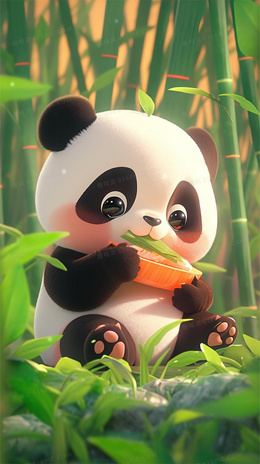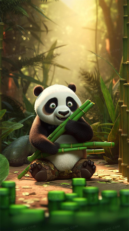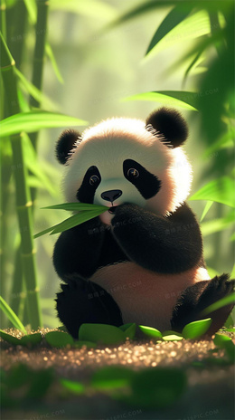 清新竹林里一只可爱的熊猫在吃竹子