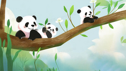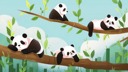 卡通一群可爱的熊猫趴在树上玩耍