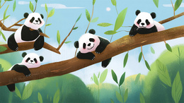 > 卡通一群可爱的熊猫趴在树上玩耍
