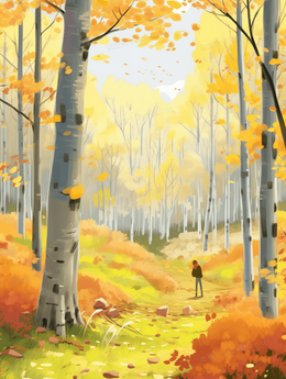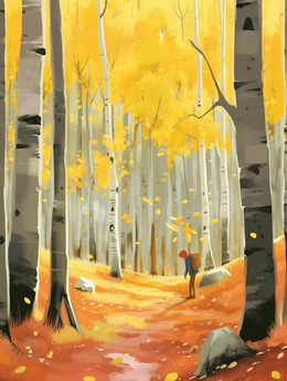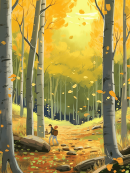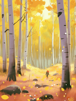 秋天金色落叶纷飞的白桦树林风景插画