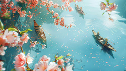 樱花树下河面上的小船插画