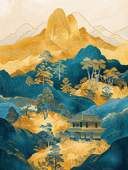 鎏金中国风高山建筑风景插画
