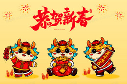 可爱国潮卡通龙年IP形象恭贺新春新年创意插画