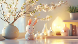 桌面上摆放插着樱花的花瓶和白色的兔子摆件图片