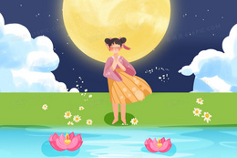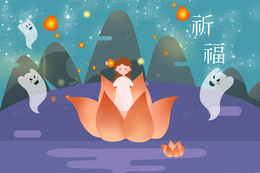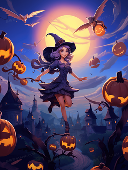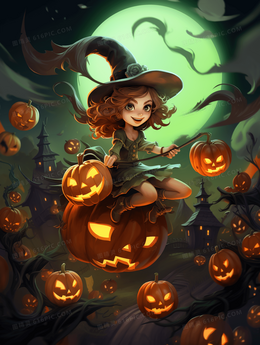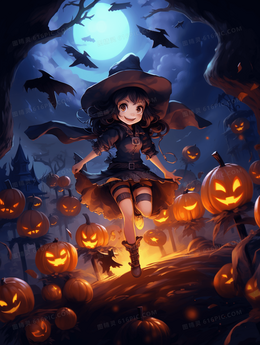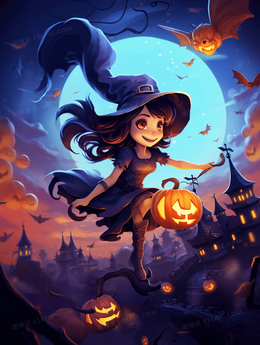 手拿南瓜灯的魔法女孩万圣节节日插画
