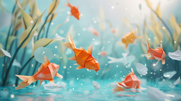 > 池塘水中的3D纸鱼插画