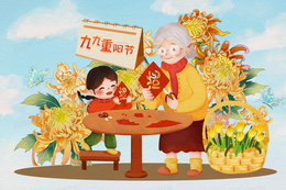 九九重阳节祖孙俩做剪纸福字传统文化创意插画