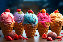 五个不同颜色口味的冰淇淋甜筒