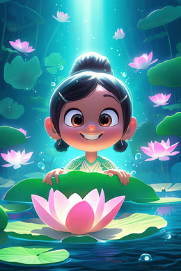 可爱的女孩趴着荷叶开心的看着前面美丽的荷花