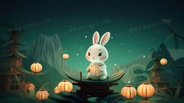 夜晚山林中被灯笼灯火照亮的可爱小白兔插画