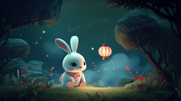 > 夜晚山林中被灯笼灯火照亮的可爱小白兔插画