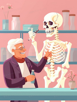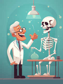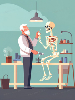 白发医生研究人体骨架插画