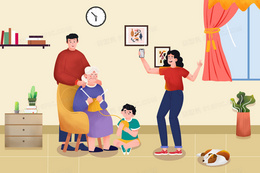 重阳节一家人在一起陪伴老人手绘插画