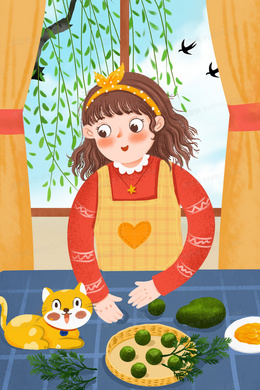 清明节女孩做青团子手绘插画