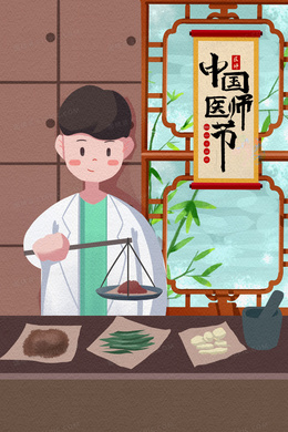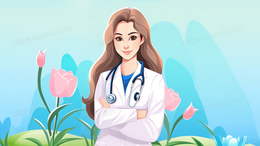 简约手绘中国医师节鲜花簇拥医生形象合成背景