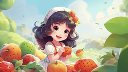 小女孩捧着丰收的水果可爱卡通插画