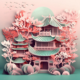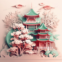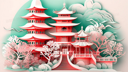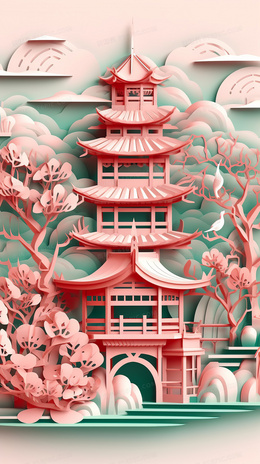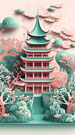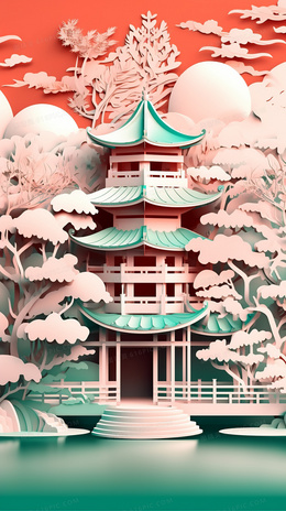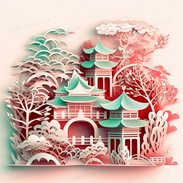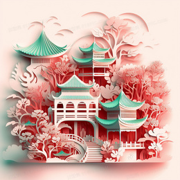 > 中国风红绿撞色亭台楼阁园林建筑创意剪纸插画