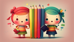 可爱的小朋友拿着文具站在彩色铅笔旁边创意儿童插画
