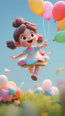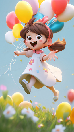 可爱的小女孩拿着彩色的气球开心的跳到半空