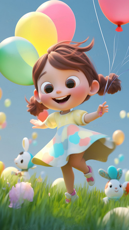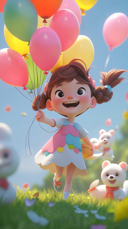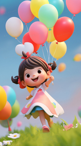 可爱的小女孩拿着彩色的气球开心的跑向前方