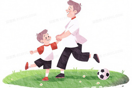 卡通爸爸和儿子手牵手在开心的踢足球