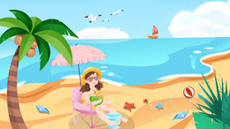 夏天女孩在沙滩上手绘插画