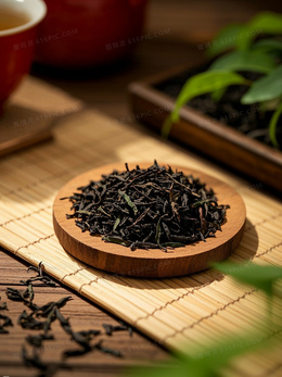 画面中一块古朴的木托上堆满了深褐色的茶叶