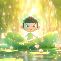 穿着绿色裙子的荷花精灵女孩站在荷叶上