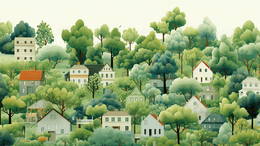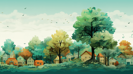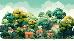 > 唯美房屋被绿色大树环绕创意插画