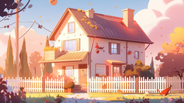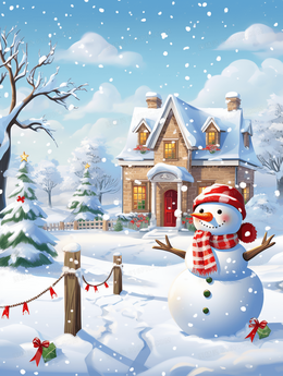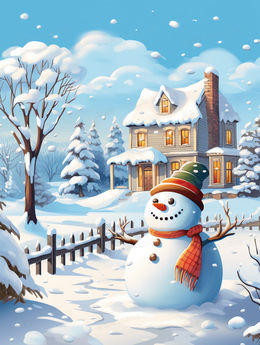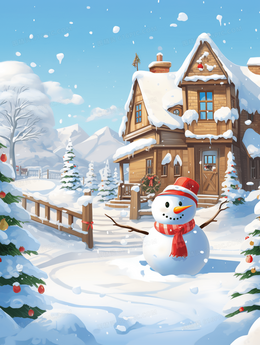 冬季下雪天村庄别墅院子里的雪人风景插画