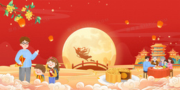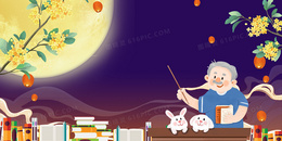 > 双节同庆学生献花月饼玉兔插画风中秋教师节背景