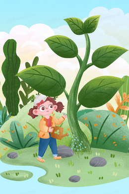卡通手绘女孩浇水植树插画