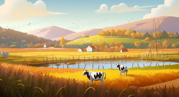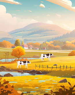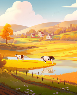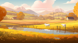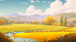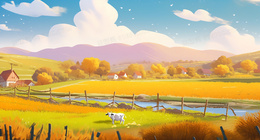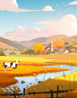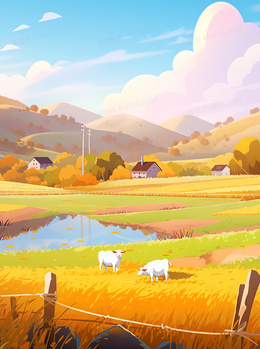 > 金色秋天郊外农庄唯美自然风光创意插画