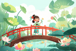 可爱的小女孩手上拿着采摘的荷花站在木桥上