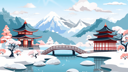 冬季中国风古建筑山水雪景插画