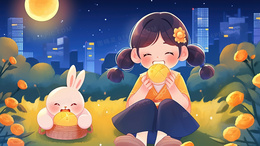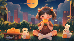中秋节卡通可爱女孩与兔子插画