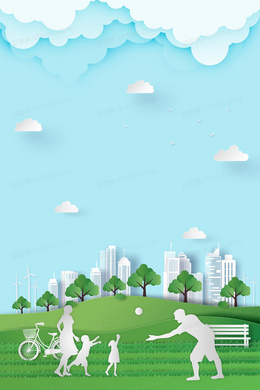 蓝色卡通剪纸风城市户外一家人玩耍背景图