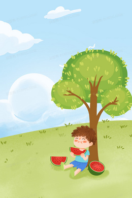 夏天孩子户外吃西瓜插画