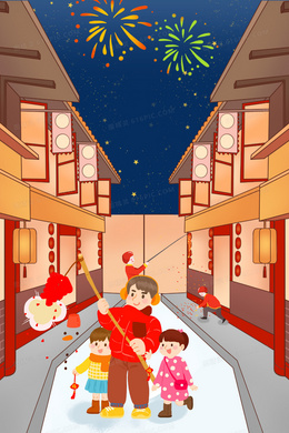春节家长带孩子户外放鞭炮插画