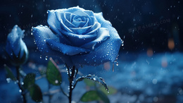 > 细雨中站着水珠的蓝玫瑰插画
