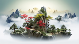 蓝色立体浮雕中国风山水树木建筑风景插画