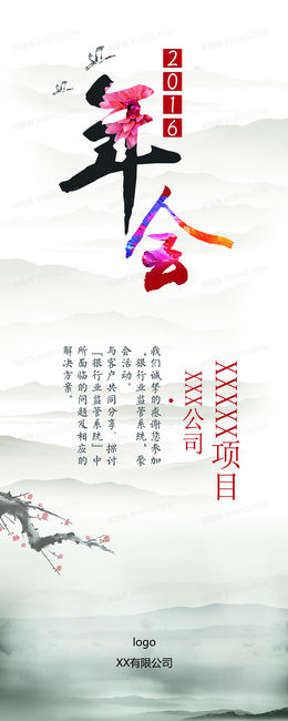 公司中国风山水画梅花年会易拉宝