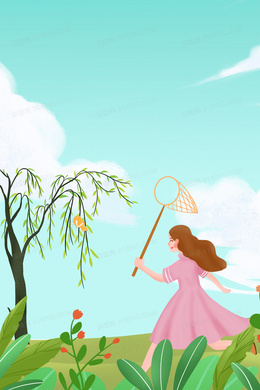 创意手绘卡通春天踏青放风筝背景