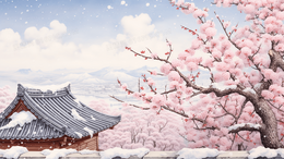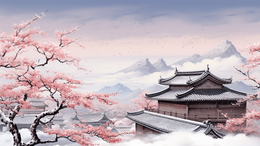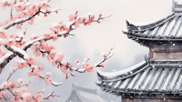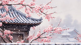 冬季下雪天古典建筑旁的粉色梅花风景插画